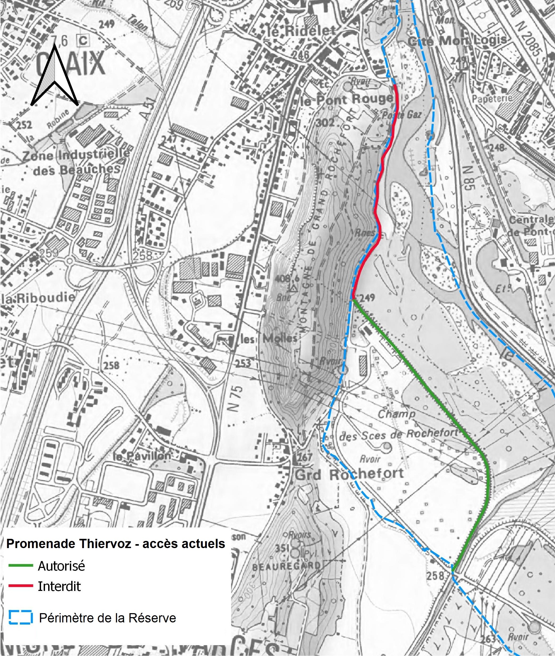 Le risque de chutes de blocs étant toujours présent, la circulation n’est pas rétablie le long du versant est du Grand Rochefort. Par contre, la promenade est désormais ouverte sur le tronçon longeant les champs captants de Grenoble-Alpes. Les usagers doivent toutefois faire demi-tour devant les barrières et donc faire un aller-retour depuis Varces (voir plan ci-dessous).